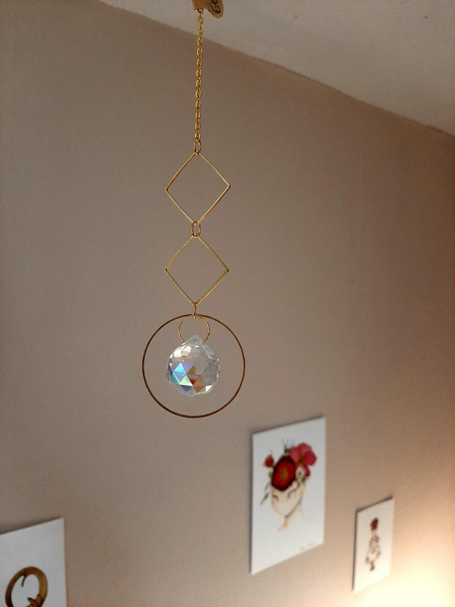 Suspends-le devant une fenêtre ou une porte, là où les rayons du soleil viendront caresser ses grosses perles aux mille et une facettes. Les reflets de lumière danseront dans ta pièce comme des poussières de fée ou des étoiles scintillantes. 🌟